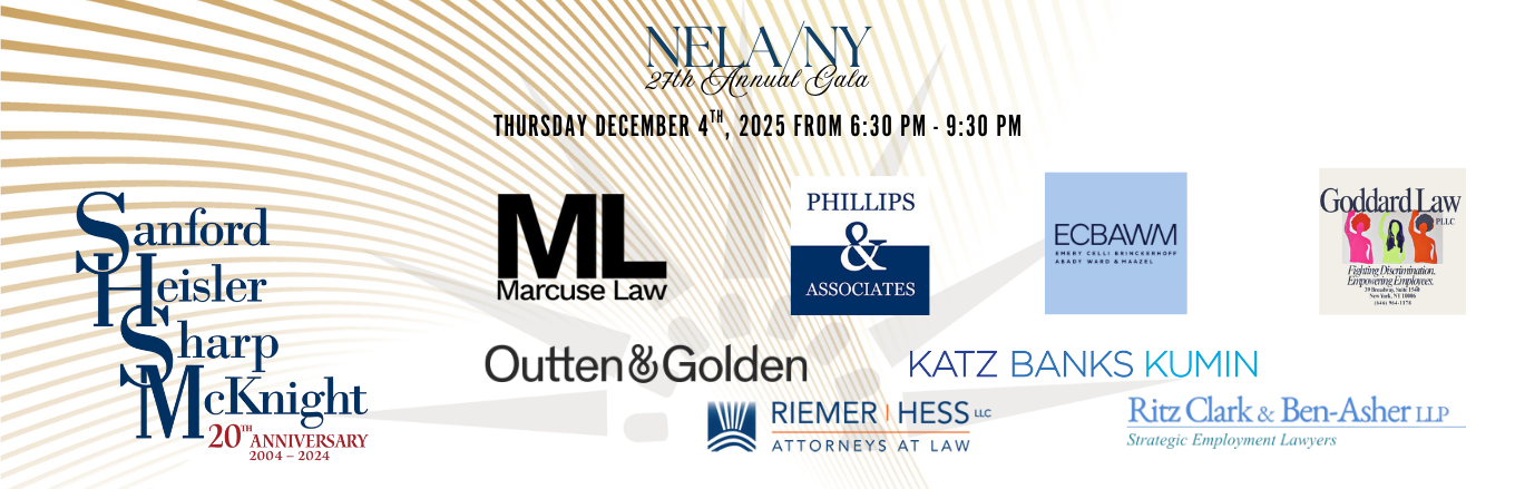 NELA/NY, the local affiliate of the National Employment Lawyers Association ("NELA"), advances and encourages the professional development of its members through networking, educational programs, publications and technical support. NELA/NY also promotes the workplace rights of individual employees through legislation, a legal referral service, and other activities, with an emphasis on the special challenges presented by New York's employment laws.